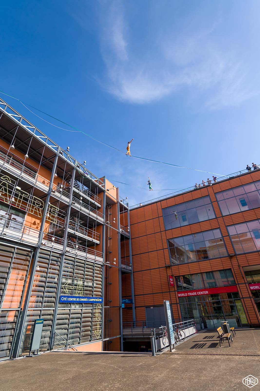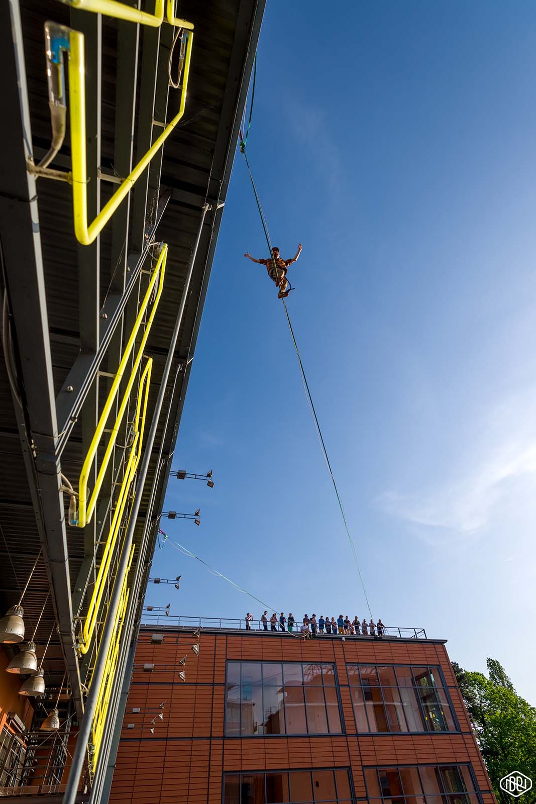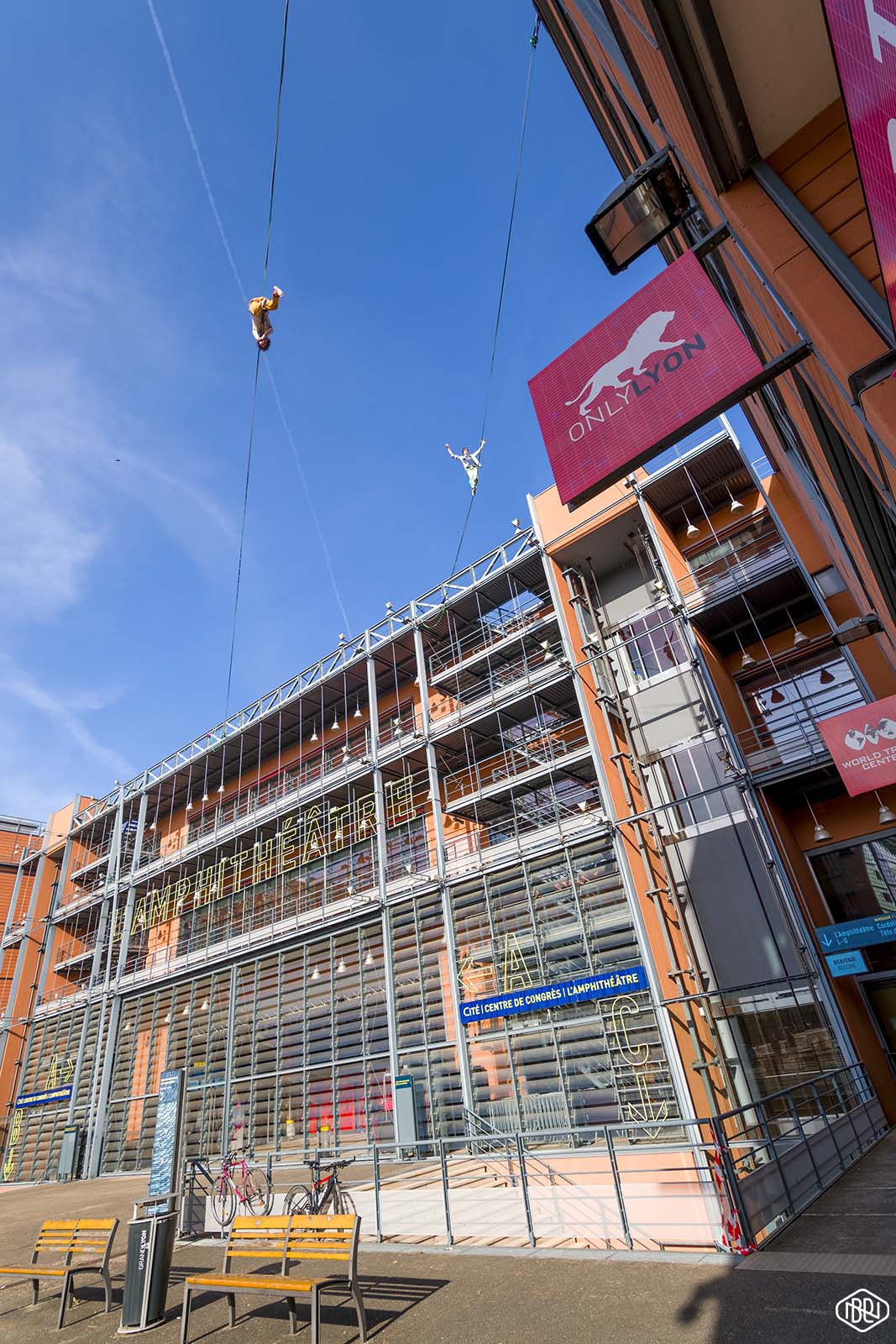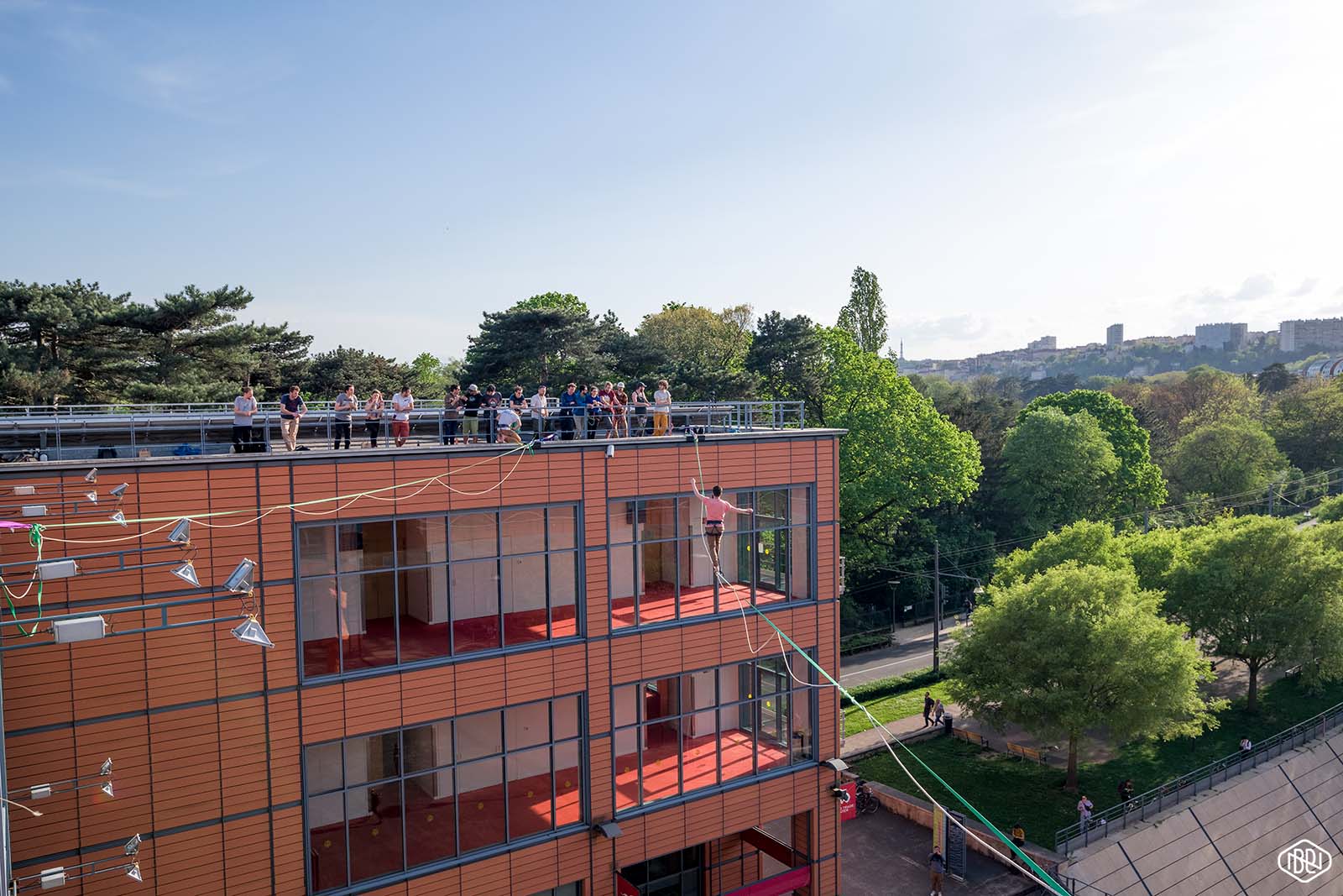 Pour une deuxième année, le Centre des Congrès de Lyon nous a permis d’installer nos sangles sur le toit de l’Amphithéâtre 3000. Deux lignes urbaines de 25 et 45 mètres, sur lesquelles une vingtaine de membres de l’asso ont eu l’opportunité de pratiquer notre sport dans un tout autre décor. Un cadre urbain fait de verrières, de passants et de béton qui nous change fortement des montagnes où nous côtoyons habituellement les arbres, le caillou et si peu de monde !