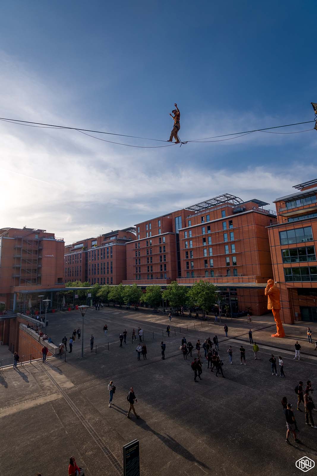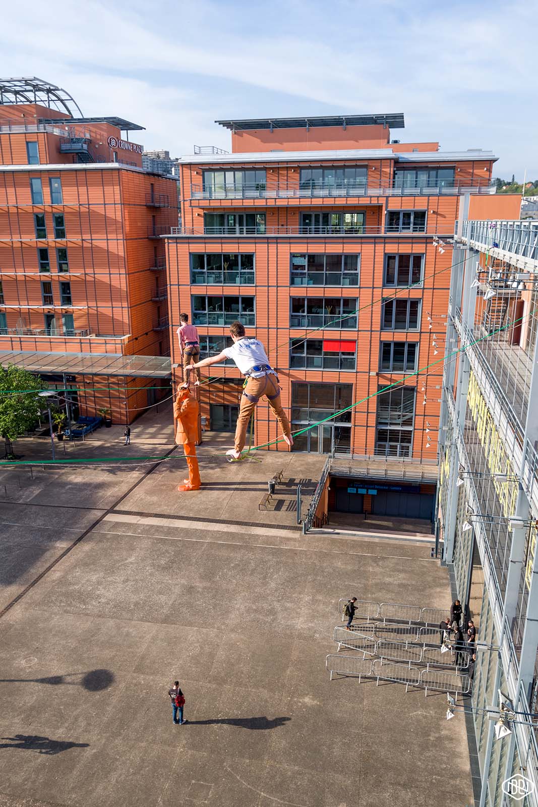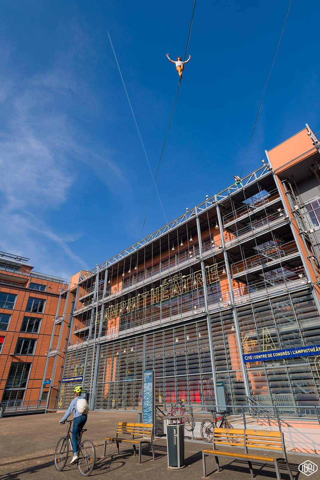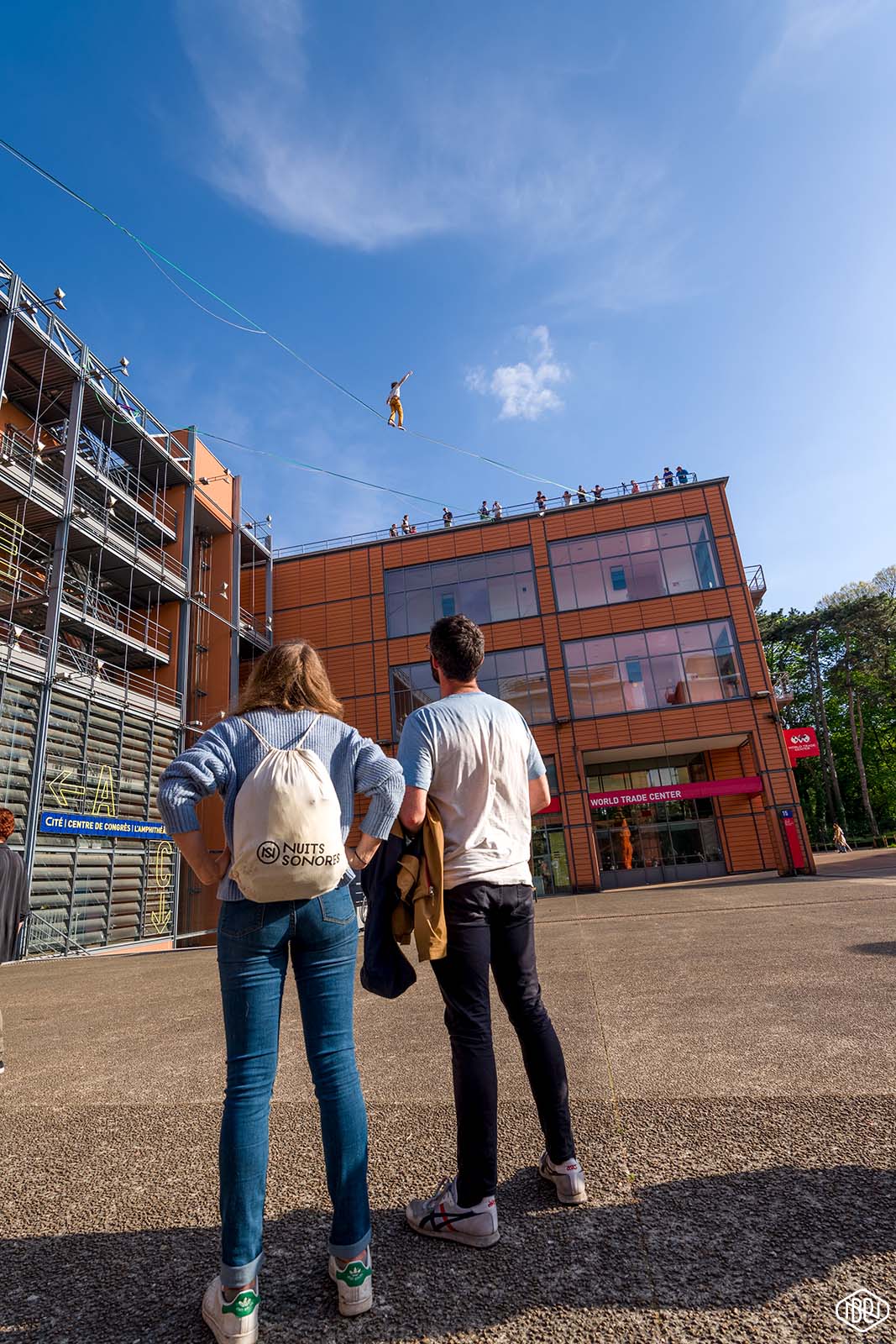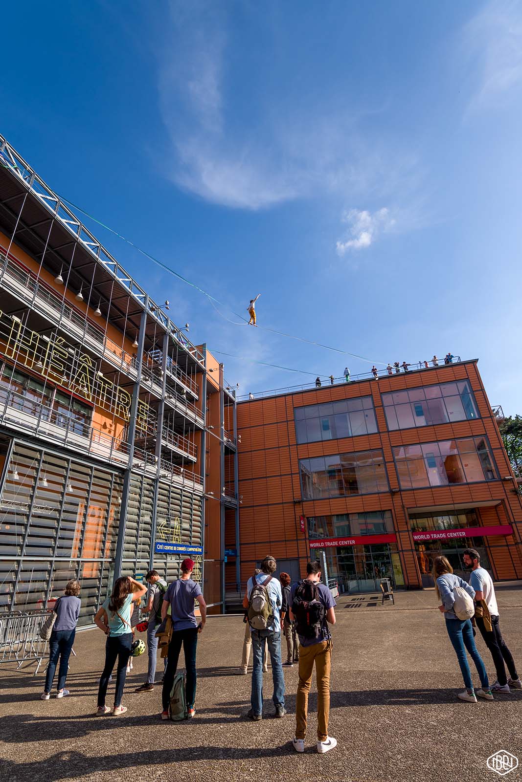 Habitués à pratiquer dans les airs, dans le calme et la solitude, les highliners présents ce jour-là ont eu droit à un panorama assez inhabituel, marchant cette fois au niveau des bureaux et surplombant la foule de cinéphiles montagnards en chemin pour le festival. Si certains highliners ont pu en jouer, d’autres ont pu appréhender une autre forme de pression dûe aux regards du public et non plus seulement à celui du vide.