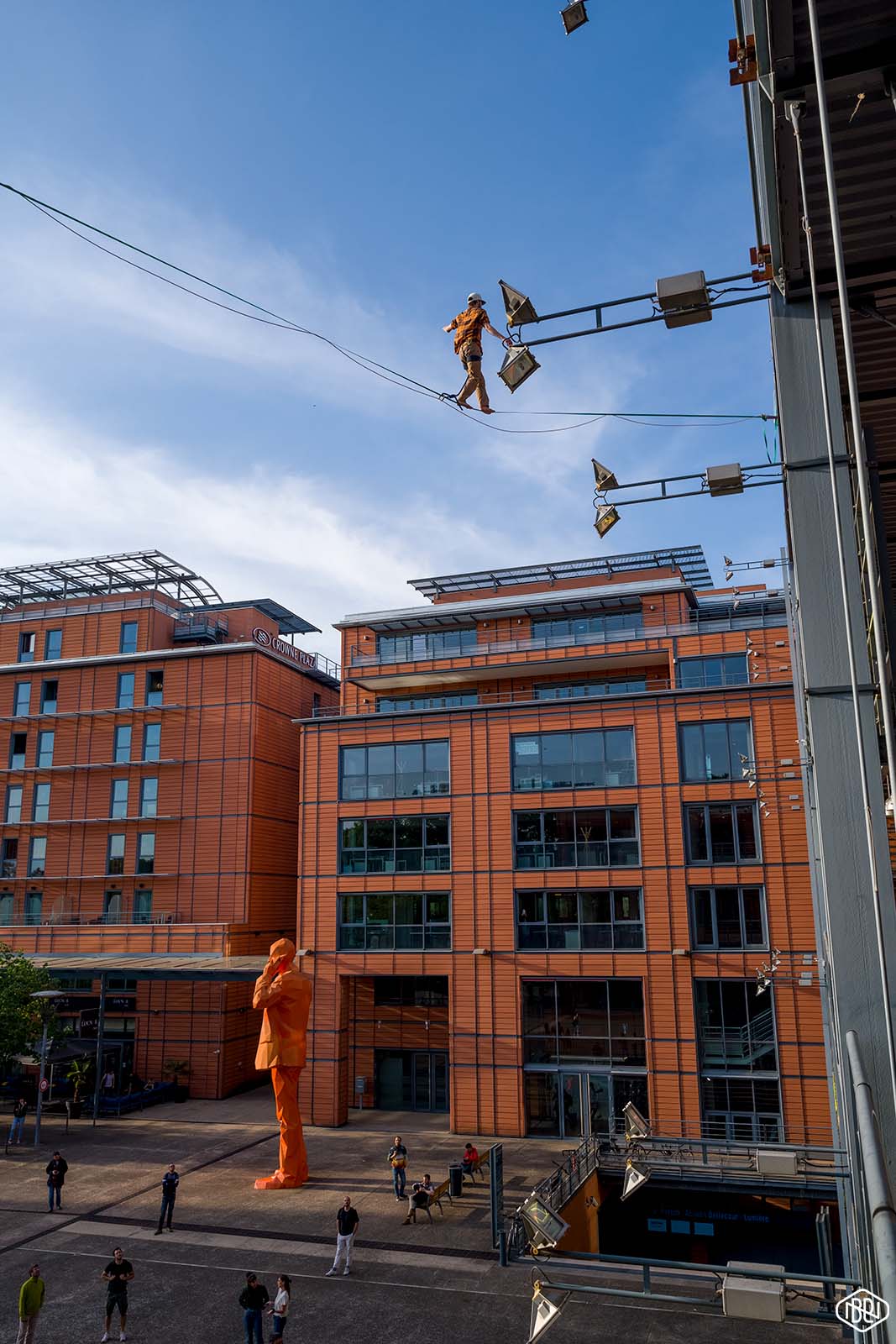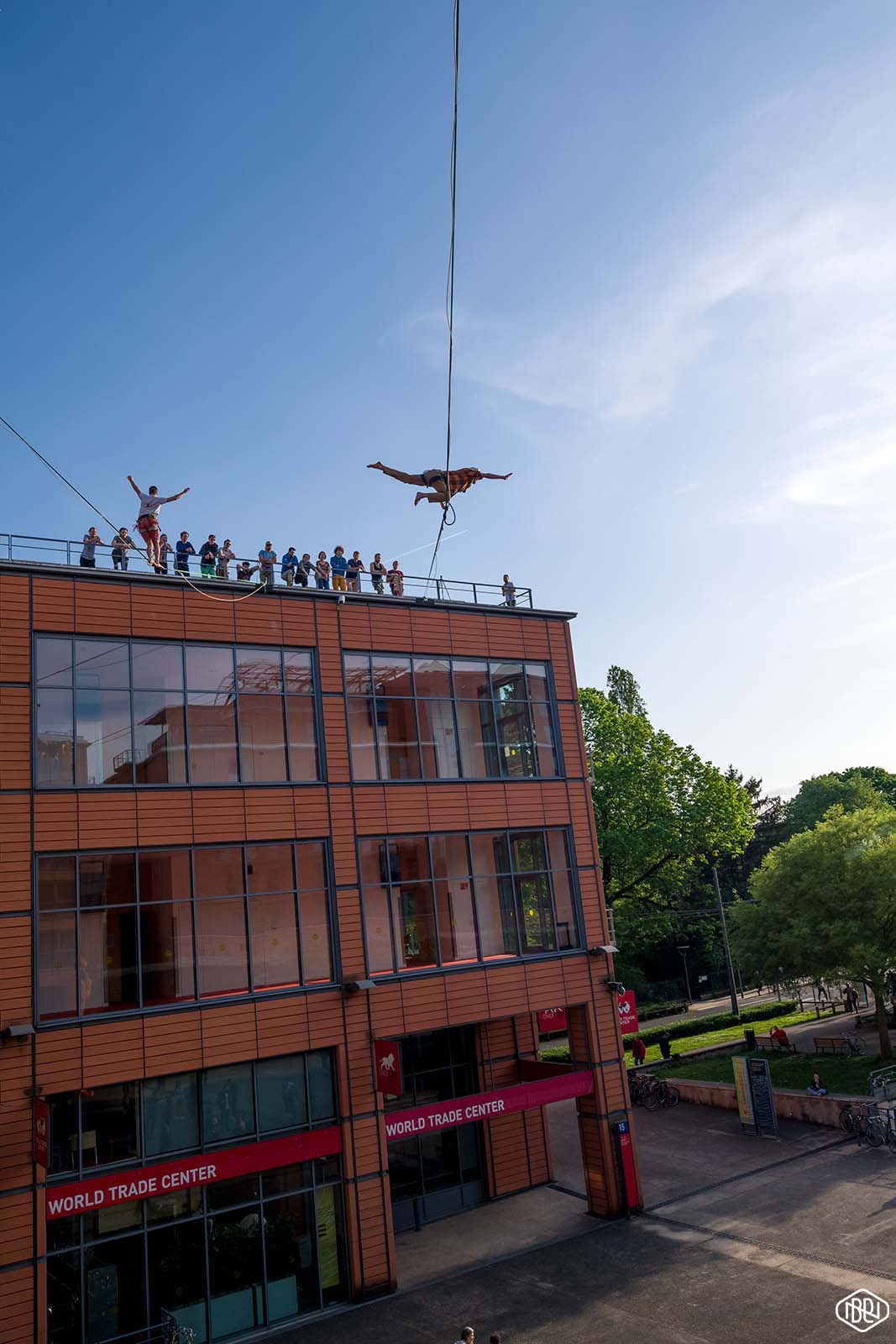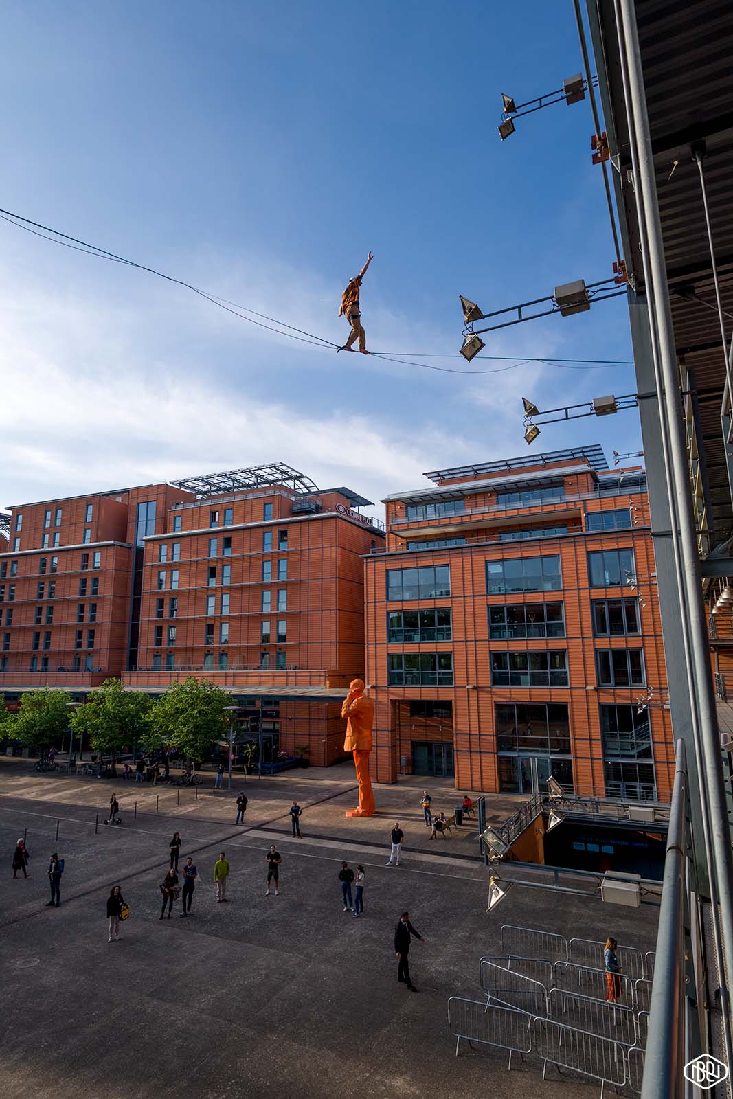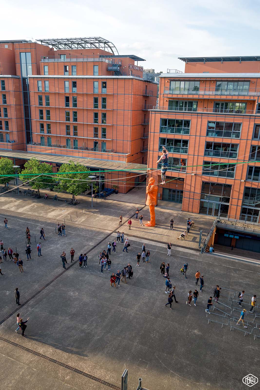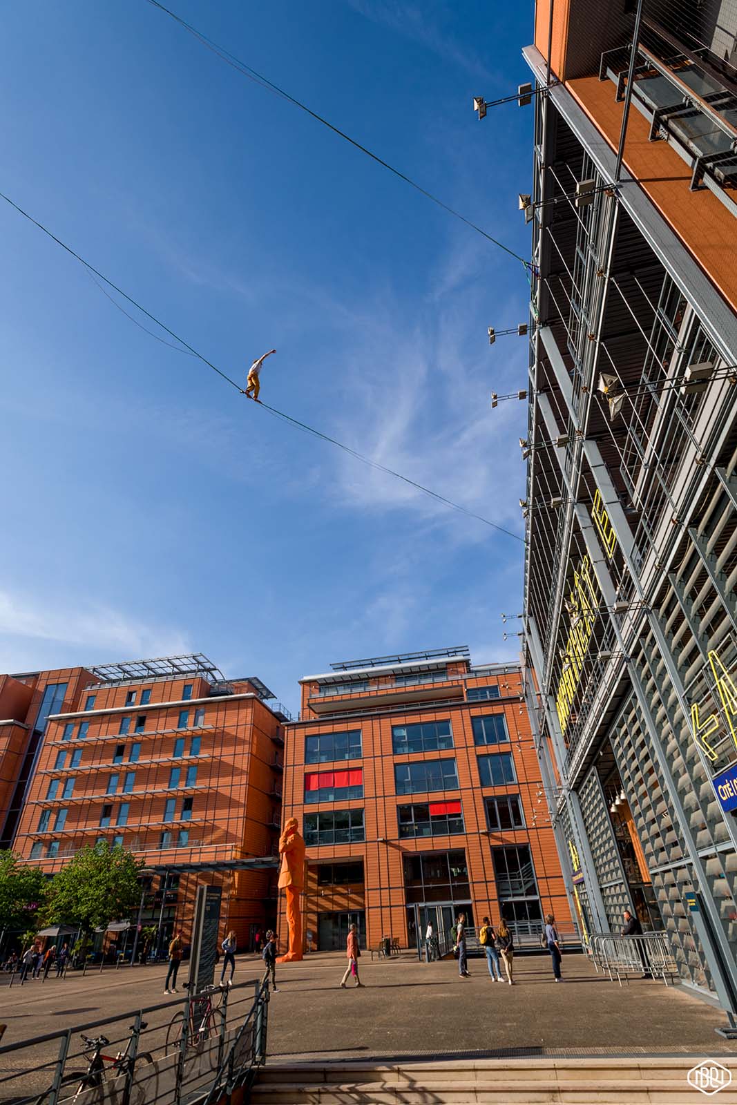 Habitués à pratiquer dans les airs, dans le calme et la solitude, les highliners présents ce jour-là ont eu droit à un panorama assez inhabituel, marchant cette fois au niveau des bureaux et surplombant la foule de cinéphiles montagnards en chemin pour le festival. Si certains highliners ont pu en jouer, d’autres ont pu appréhender une autre forme de pression dûe aux regards du public et non plus seulement à celui du vide.
